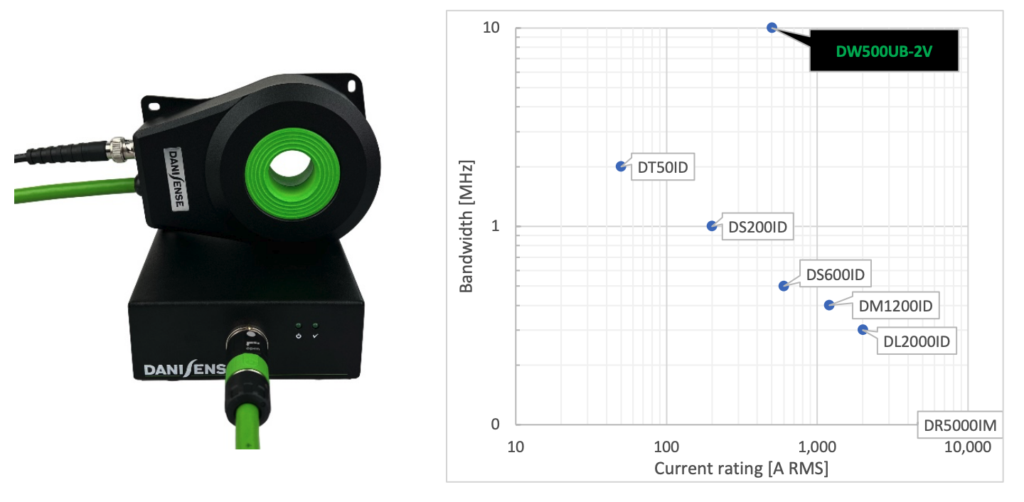 Power conversion products based on wide bandgap semiconductor technologies such as gallium nitride (GaN) and silicon carbide (SiC) are now operating at significantly higher switching frequencies which can generate almost perfect sinusoidal waveforms. Filter elements such as chokes and capacitors can be made smaller and lighter because the inductance values of the chokes and the capacitances of the capacitors are inversely proportional to the switching frequency. In the future, SiC- and GaN-based components will continue to gain acceptance in more applications. Danisense introduce the new model DW500UB-2V with the capability to handle the wide bandwidths now required.
